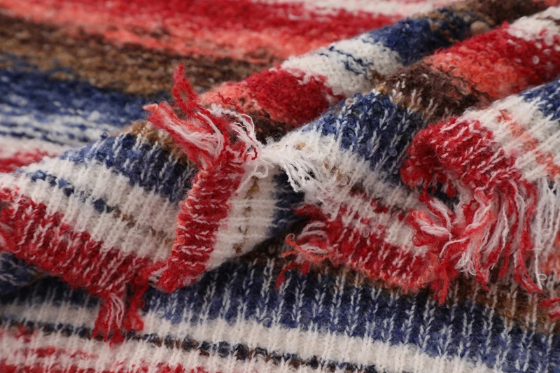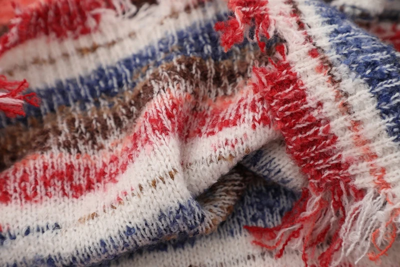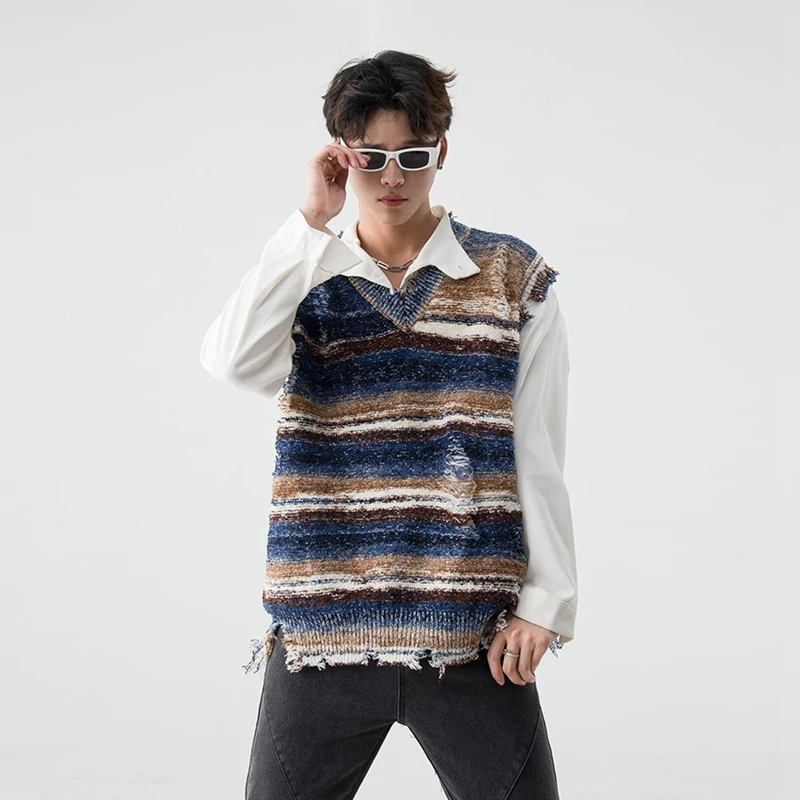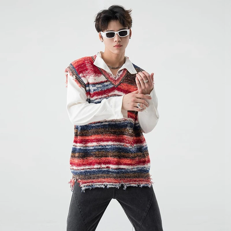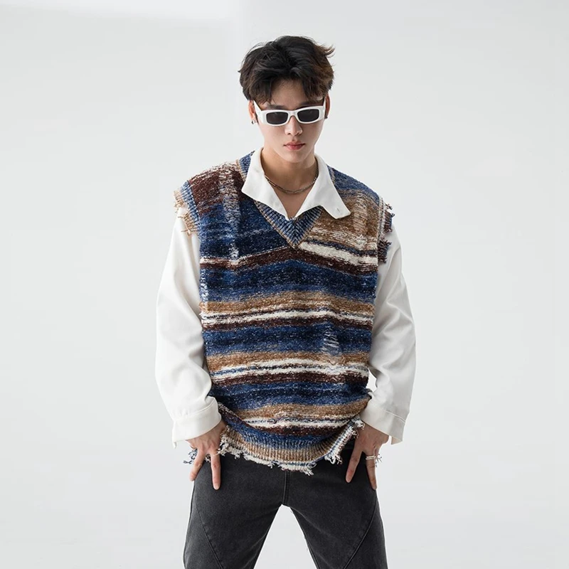 Gradient Stripe Sleeveless Washed Ripped Tie-Dye V-Neck Loose Knit Pullover Sweater Vest