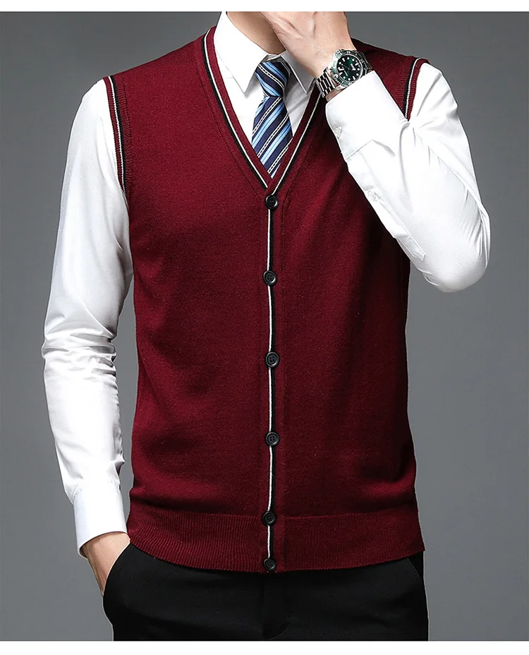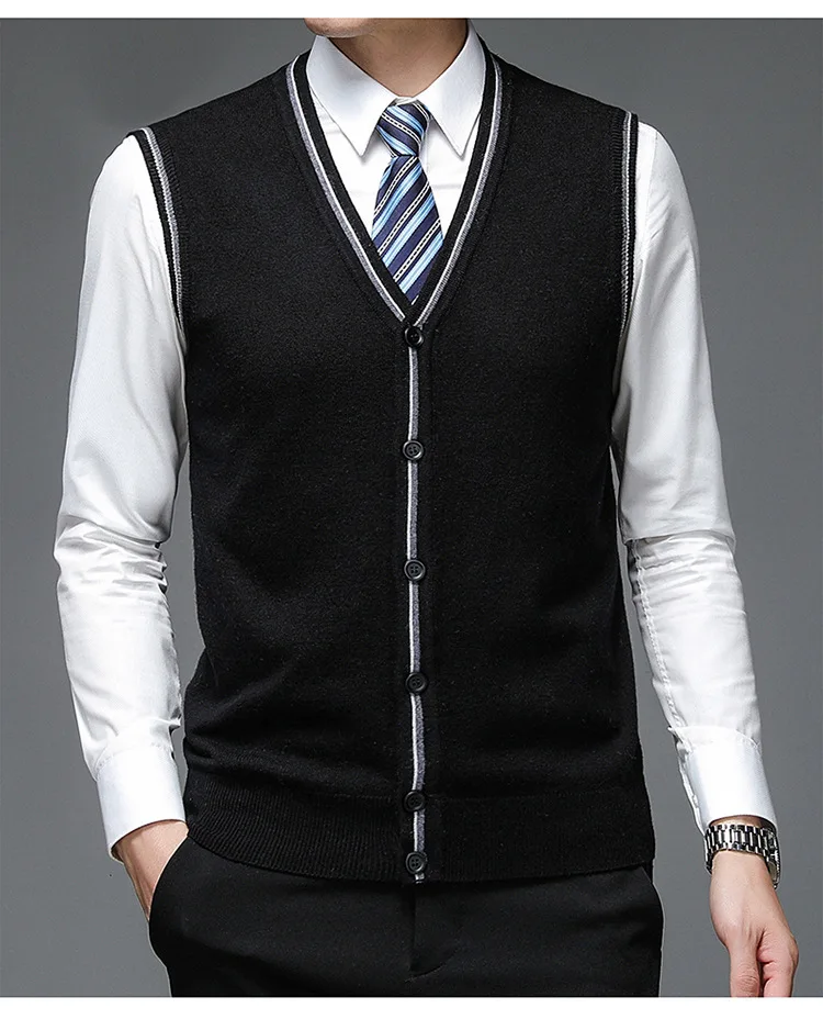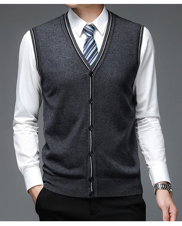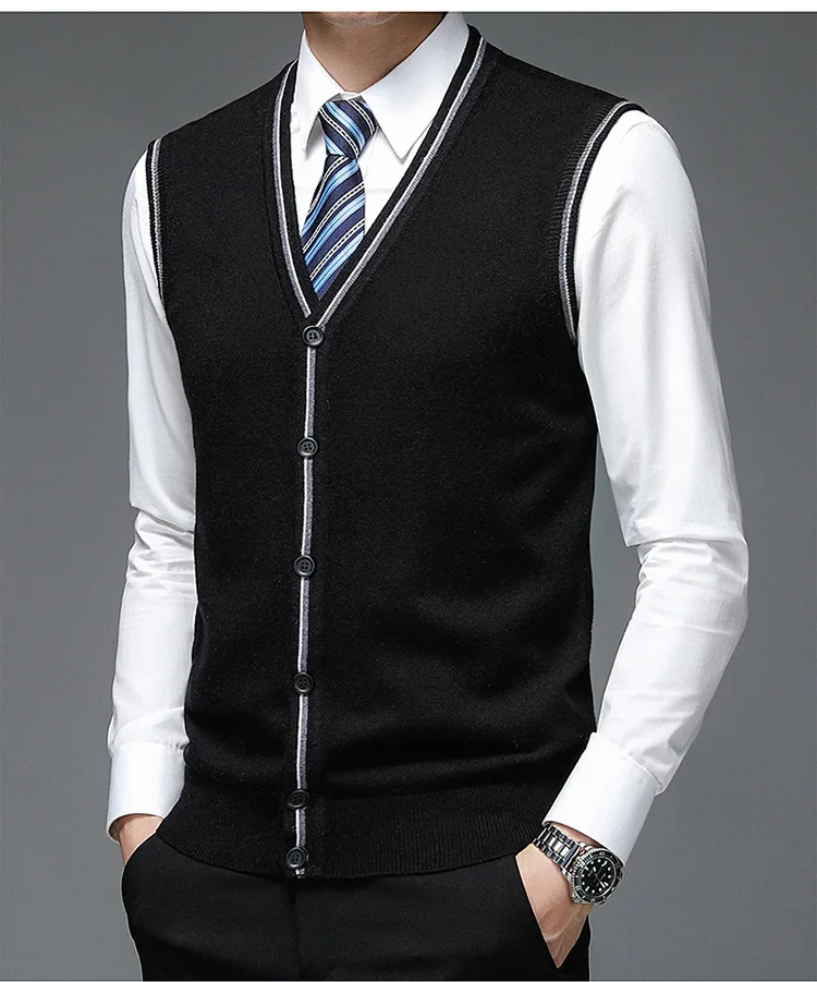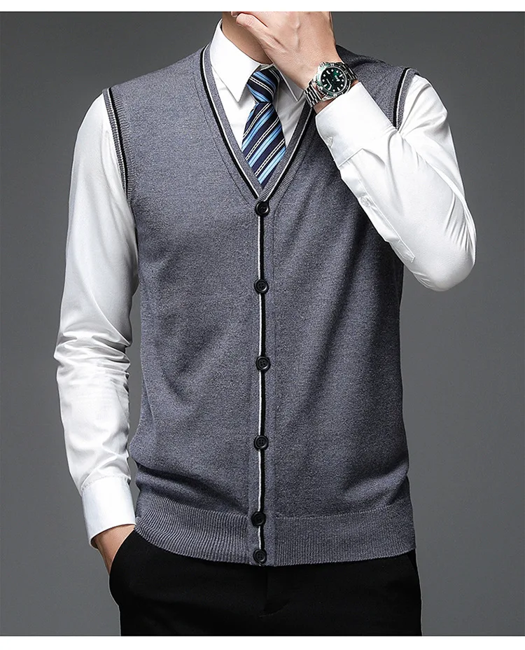Men's Solid V-Neck Wool Cardigan Knit Vest Trendy Sleeveless Casual Sweater