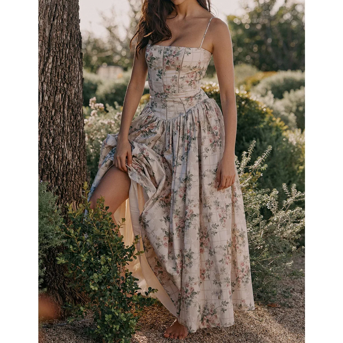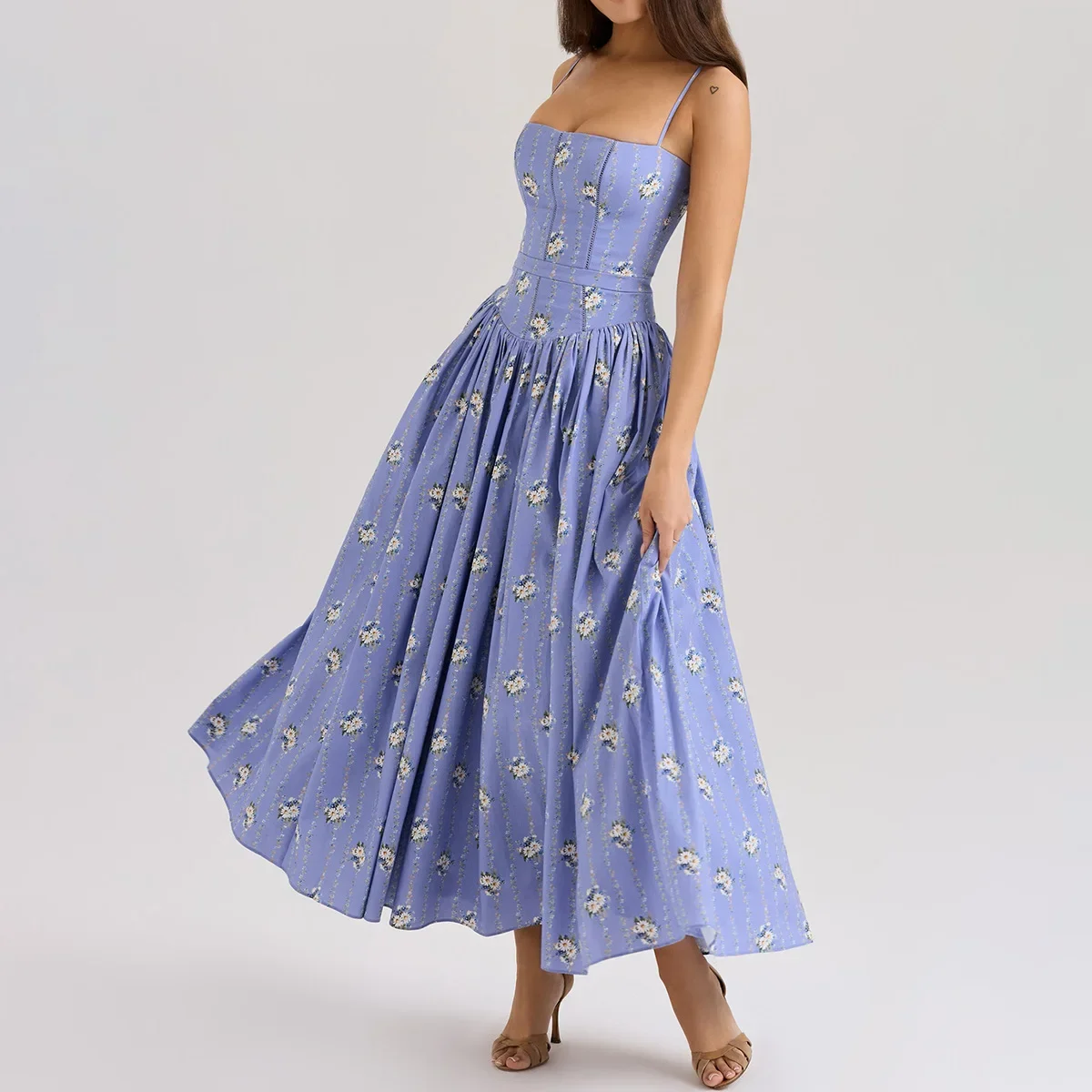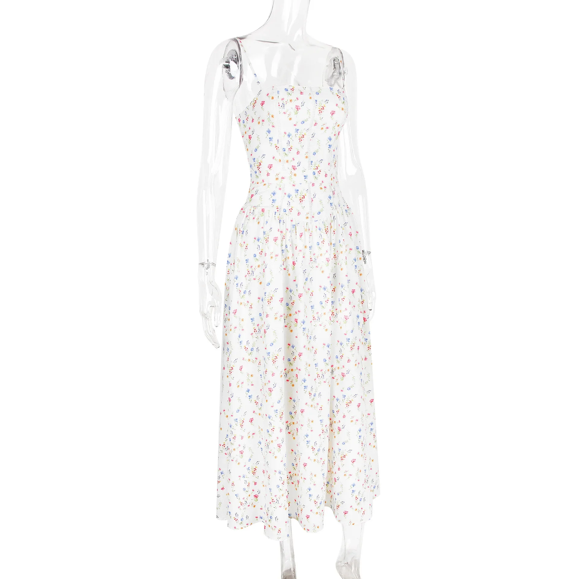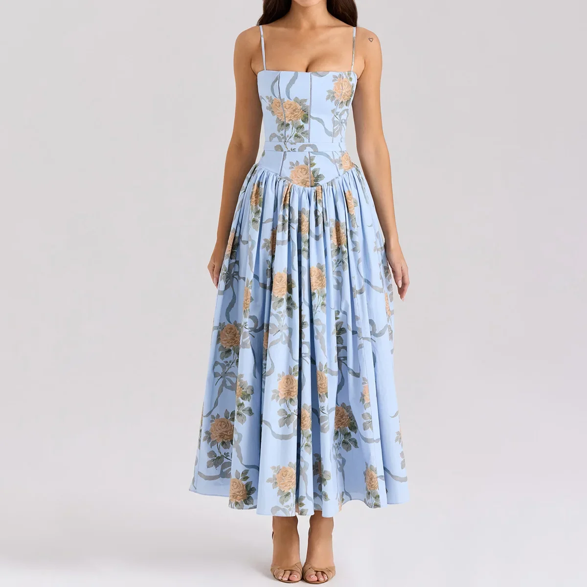 Floral Print Elegant Spaghetti Strap Flowy Midi Sundress Summer Boho Beach Dress for Women